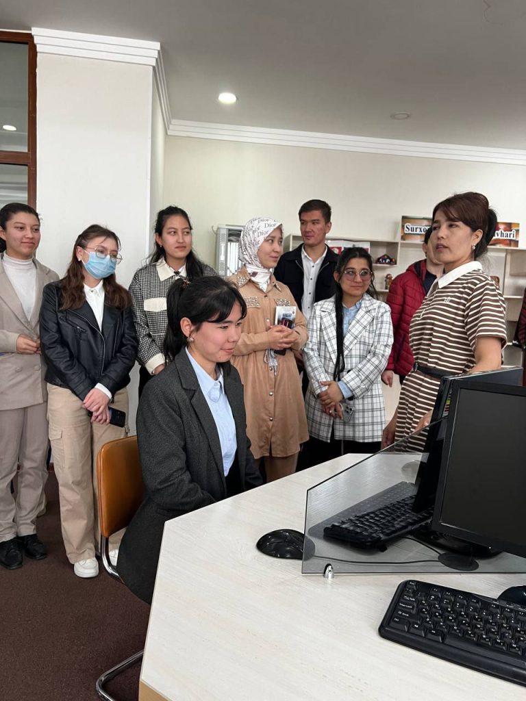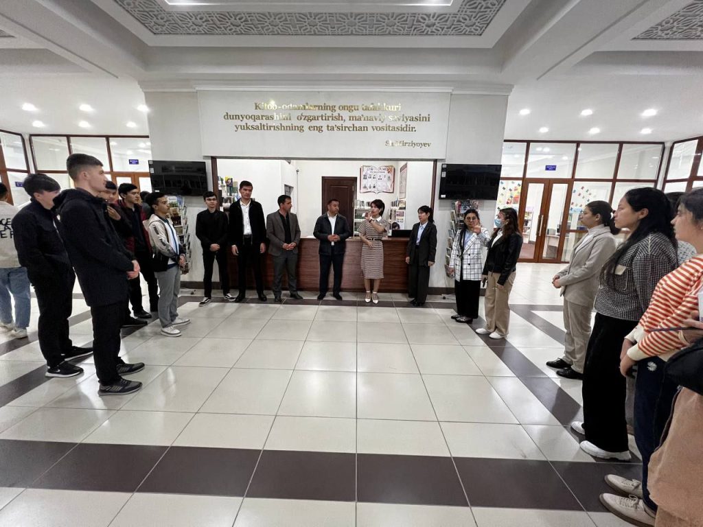 Sayohat davomida kutubxona xodimi talaba- yoshlarga kutubxonadagi kitobxonlar uchun yaratilgan sharoitlar bilan tanishtirdi.