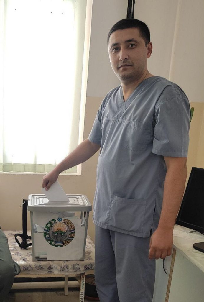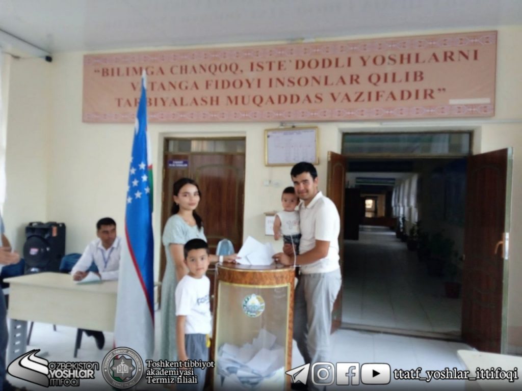 Toshkent tibbiyot akademiyasi Termiz filialining , Yoshlar ittifoqi boshlang‘ich tashkiloti yetakchisi — Boboyorov Sardor o‘zining oila a’zolari bilan birgalikda, Angor tumanidagi 130-saylov uchastkasida Vatan istiqboli, millat kelajagi, xalq farovonligi, mamlakat taraqqiyoti uchun munosib nomzodga ovoz berdi…