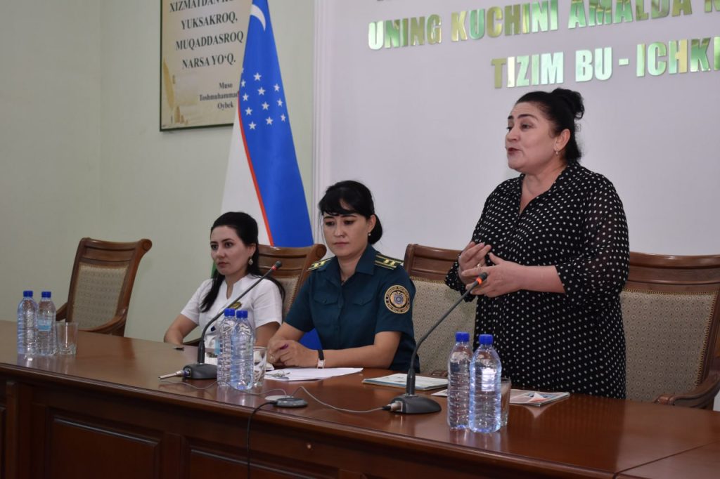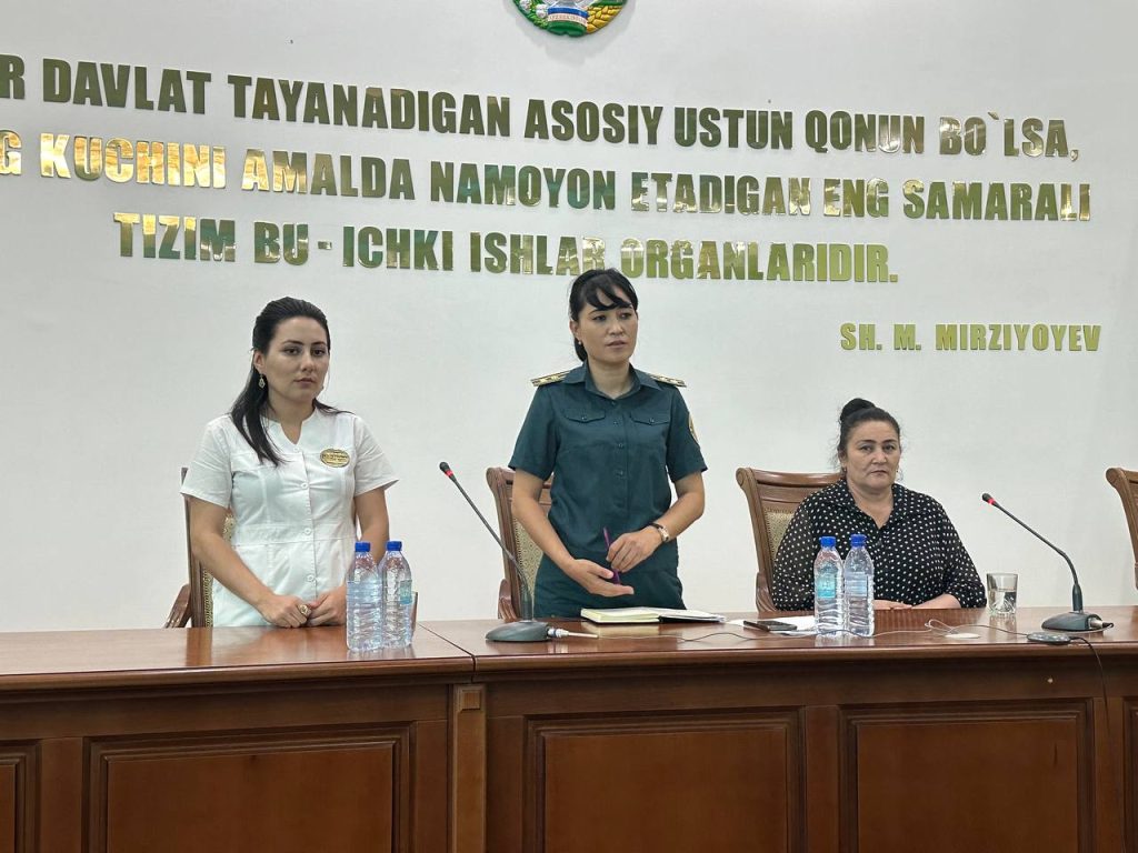 Surxondaryo viloyati ichki ishlar organlarida xizmat olib borayotgan xotin-qizlarning Oilada reproduktiv salomatlikni mustahkamlash, ularning tibbiy madaniyatini oshirish maqsadida Surxondaryo viloyat hokimiyati qoshidagi Sog‘lom avlod uchun xayriya fondi mutaxassisi, ginekolog shifokori Jumaeva Salima Ziyodullaevna va Surxondaryo viloyati Onkologiya ilmiy amaliy markazi shifokori Jo‘raeva Gulbahor Alisherovnalar ishtirokida davra suhbati bo‘lib o‘tdi.