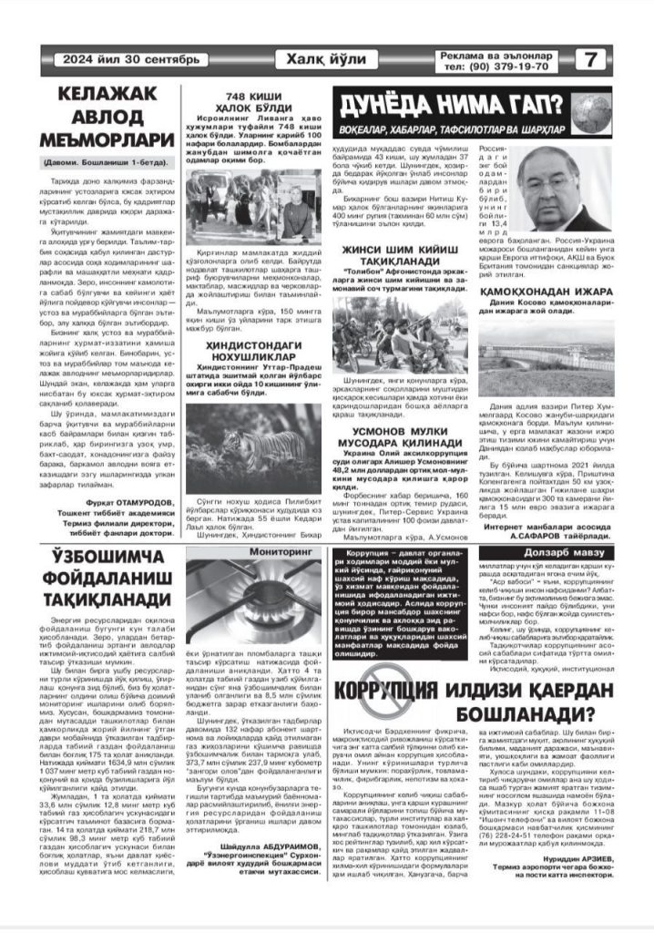 TTA Termiz filiali direktori Otamuradov Furqat Abdukarimovichning 1- oktyabr «O’qituvchi va murabbiylar kuni munosabati bilan “Kelajak avlod me’morlari” mavzusidagi maqolasi “Xalq yo‘li” gazetasida chop etildi.